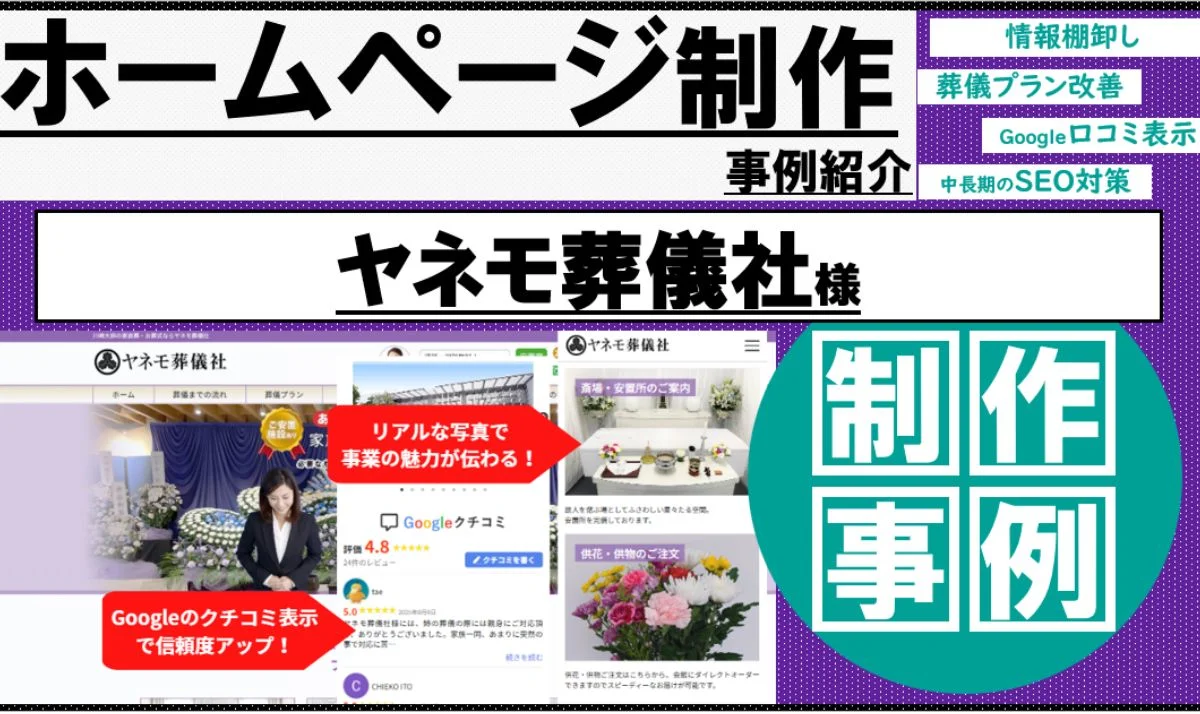 「パンフレットの情報が古い」「地域の方に事業内容が伝わりにくい」そんな課題を抱える葬儀社様に役立つ事例です。本記事では、神奈川県川崎市のヤネモ葬儀社様のホームページを新規制作し、情報を整理して使いやすさを重視した“分かりやすく伝わる”構成に仕上げた実例をご紹介します。口コミ表示やスマホ最適化、安心して運用できる体制も整え、地域の方が迷わず必要な情報にたどり着き、問い合わせへ進めるホームページを実現しました。