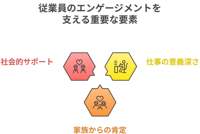 一方で、同じ調査から「仕事の意義深さ」「家族からの肯定的な反応」「社会的サポート」が、従業員のエンゲージメントを支える重要な要素であることも示されました。