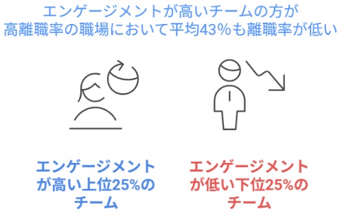たとえば、エンゲージメントが上位25%のチームは、下位25%のチームと比べて、高離職率の職場において平均43%も離職率が低いという結果が報告されています。