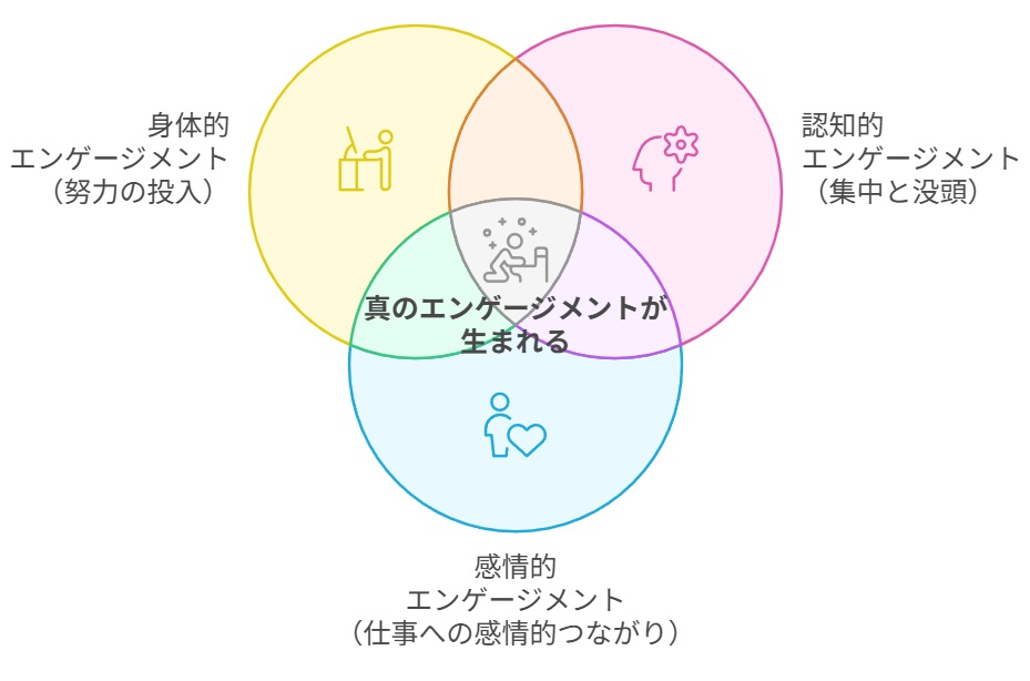身体的エンゲージメント(努力の投入)、認知的エンゲージメント(集中と没頭)、感情的エンゲージメント(仕事への感情的つながり)です。