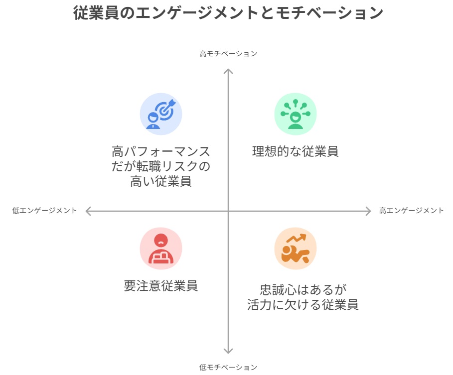 「エンゲージメントもモチベーションも高い」理想的な従業員、「エンゲージメントは高いがモチベーションが低い」忠誠心はあるが活力に欠ける従業員、「モチベーションは高いがエンゲージメントが低い」高パフォーマンスだが転職リスクの高い従業員、そして「両方とも低い」要注意従業員です。