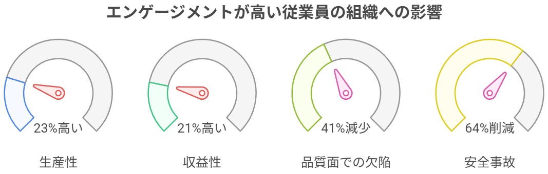 ギャラップ社の「従業員エンゲージメントのメリット」によると、エンゲージメントの高い従業員は生産性が23%高く、高エンゲージメントのチームを持つ組織では収益性が21%高いことが明らかになっています。