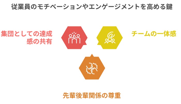 代わりに、チームの一体感、先輩後輩関係の尊重、集団としての達成感の共有が従業員のモチベーションやエンゲージメントを高める鍵となるのです。
