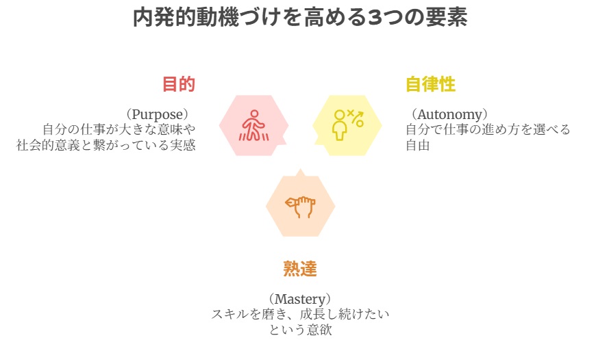 ダニエル・ピンクの研究とその後の検証により、人の※内発的動機づけを高める3つの要素が明らかになりました。それは、自律性(Autonomy)、熟達(Mastery)、目的(Purpose)です。