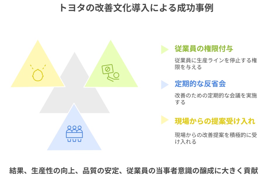 特に、従業員が問題を発見した際に自らラインを停止し、即座に課題解決に取り組む文化は、トヨタの強さの象徴として広く知られています。