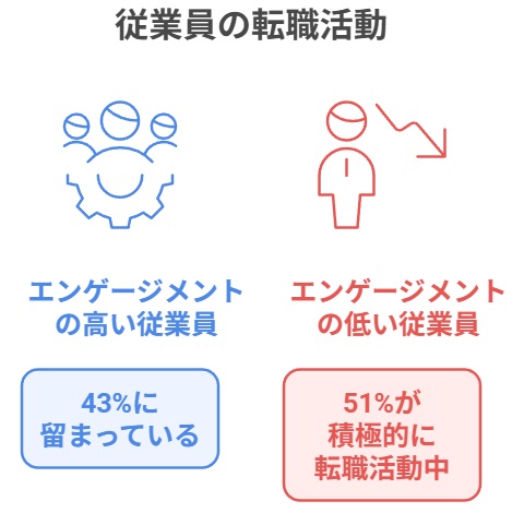 しかし一方で、エンゲージメントの低い従業員の51%が積極的に転職活動をしているのに対し、エンゲージメントの高い従業員では43%にとどまっています。