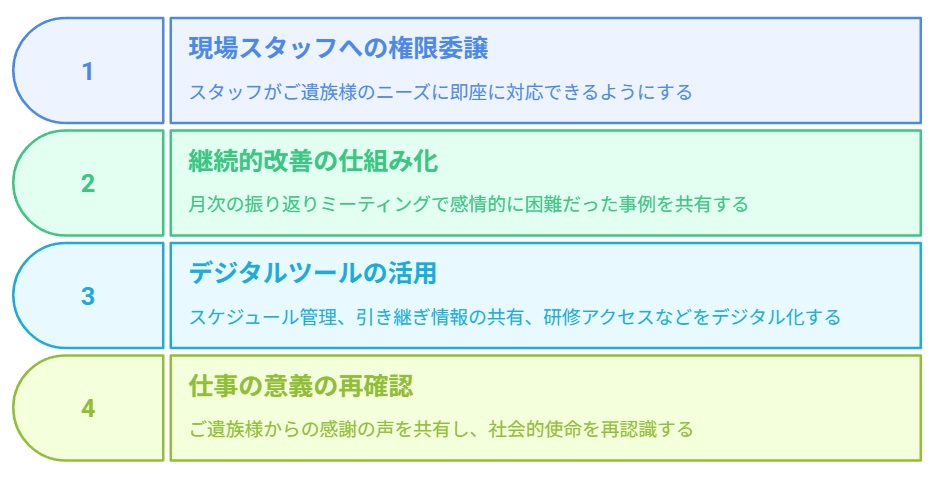 第一に、現場スタッフへの権限委譲です。ご遺族の個別ニーズに即座に対応できる裁量を与えることで、従業員の自律性とサービス品質が向上します。