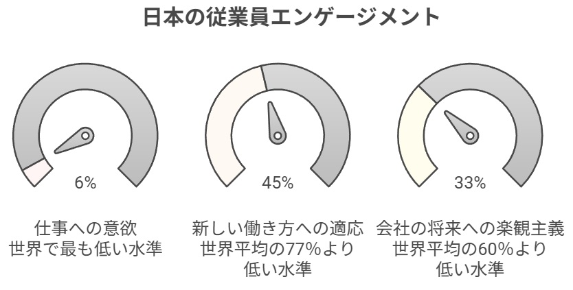 2024年にギャラップ社が発表した調査によると、日本で「仕事に意欲的かつ積極的に取り組んでいる」と答えた従業員の割合はわずか6%にとどまり、世界で最も低い水準であることが明らかになりました。