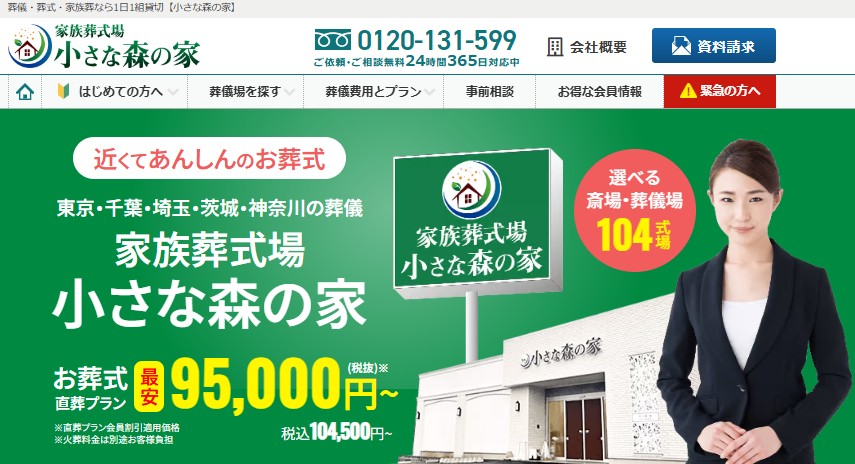 | 葬儀の流れ | 各プランページ下部に「小さな森の家のお葬式の流れ」として、ご逝去・ご安置・打ち合わせ・通夜・告別式・火葬の6段階を時系列で図解。各段階に同社の特徴も併記し、サポート体制を明確に伝えています。 |