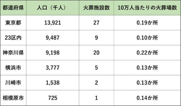 全国でもっとも人口密度が高い大阪市でも、10万人当たりの火葬場数は0.21ヵ所ですので、横浜市・川崎市の火葬事情がいかにひっ迫しているかが理解できます。