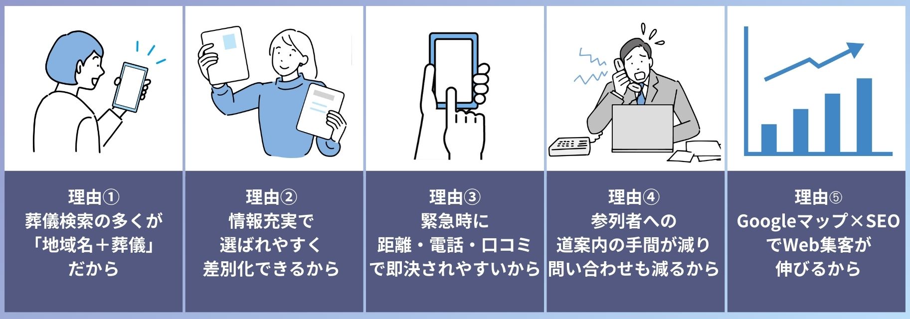 ここでは、葬儀社にとってMEO対策が欠かせない理由を、5つに分けて整理します。