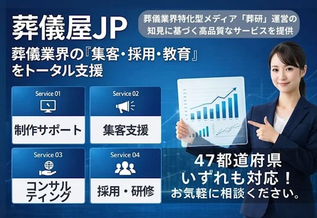 葬儀屋.jpは、葬祭業界をはじめとしたライフエンディング領域に特化して、専門的なサービスを提供しております。