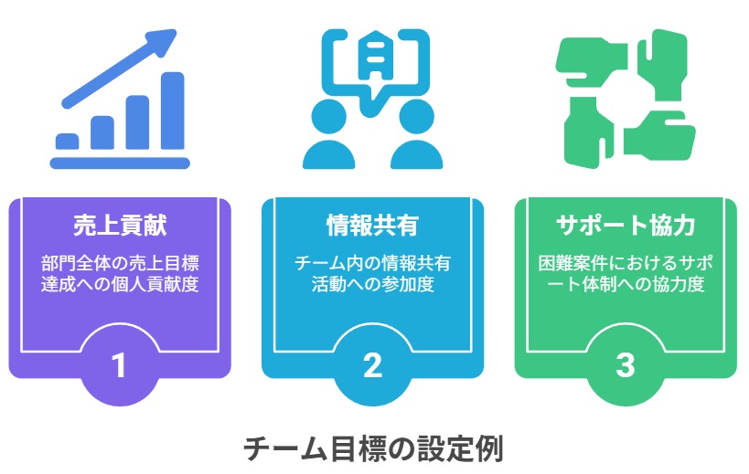 部門全体の売上目標達成への個人貢献度、チーム内の情報共有活動への参加度、困難案件におけるサポート体制への協力度を評価対象とします。