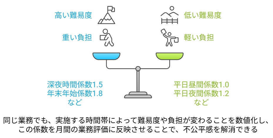 この係数を月間の業務評価に反映させることで、不公平感を解消できます。