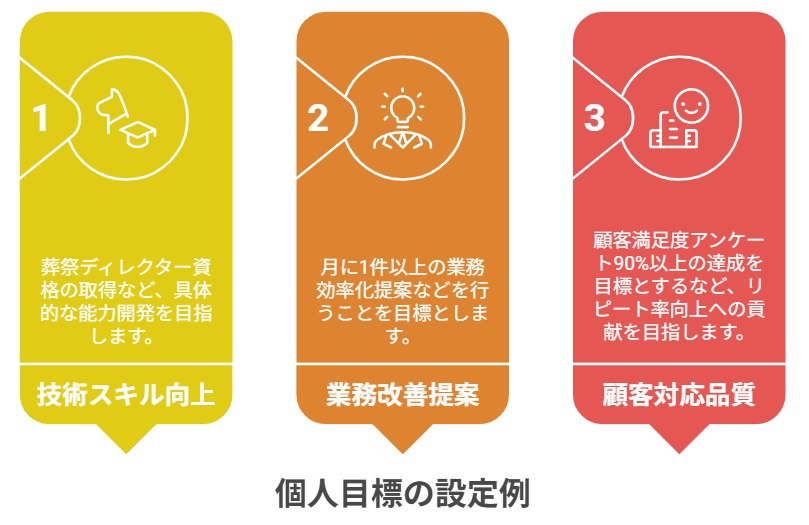 個人レベルでは、「葬祭ディレクターとしての専門性を向上させる」という目標に対して、2級資格取得、顧客満足度90%以上維持、業務改善提案月2件実施という成果指標を設定します。