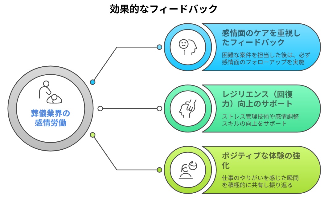 感情労働の負担を軽減するために、ストレス管理技術や感情調整スキルの向上もフィードバックに含めます。