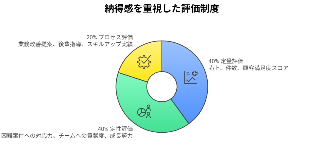 - 定量評価(40%):売上、件数、顧客満足度スコア