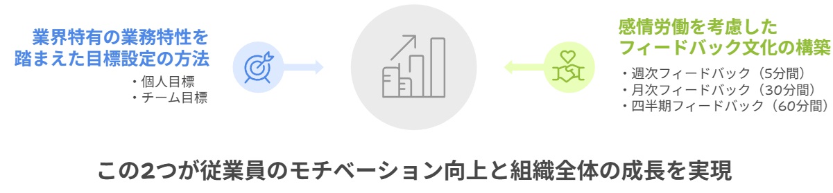 目標設定とフィードバック文化の構築により、従業員の日常的な成長を支援し、感情労働の特殊性に配慮したケアも提供することで、持続可能な働きがいのある職場環境を創出できます。