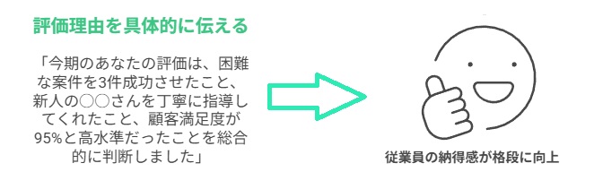 「今期のあなたの評価は、困難な案件を3件成功させたこと、新人の○○さんを丁寧に指導してくれたこと、顧客満足度が95%と高水準だったことを総合的に判断しました」と具体的に伝えることで、従業員の納得感が格段に向上します。