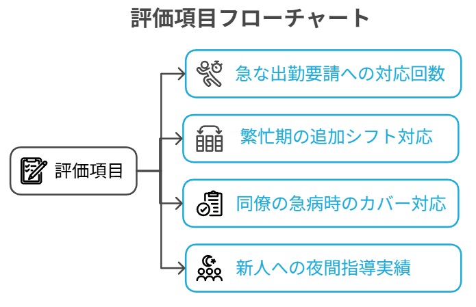 24時間体制を維持するためのシフト調整への協力度も評価項目に含めます。
