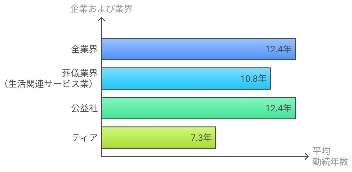 実際に、マイナビ2027によると、燦ホールディングス(株式会社 公益社)の平均勤続年数は12.4年、株式会社ティアでは7.3年と報告されています。