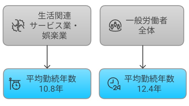 定着率の問題は深刻で、葬儀業界を含む生活関連サービス業・娯楽業の平均勤続年数10.8年は全業種平均12.4年を大幅に下回っています。