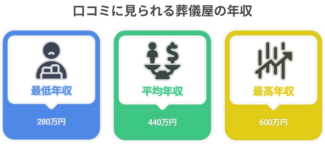 複数の転職サイトの口コミ投稿を基に算出してみると、葬儀屋の平均年収は、440万円でした。口コミに見られる年収は、280万円〜600万円の範囲に分布しています。
