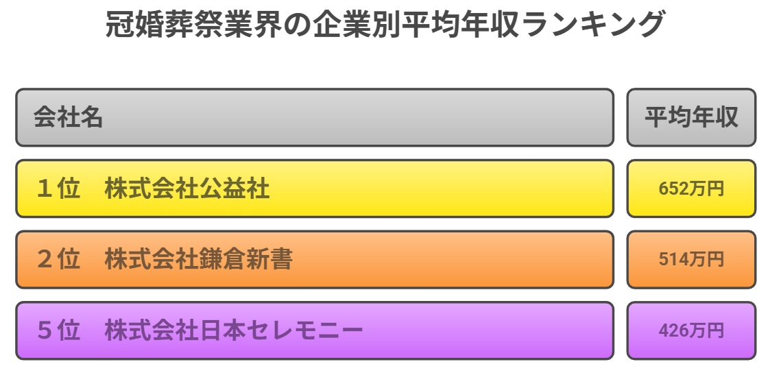 2位は株式会社鎌倉新書で平均年収514万円、3位・4位は葬儀業ではない企業がランクインしており、5位は株式会社日本セレモニーで426万円でした。
