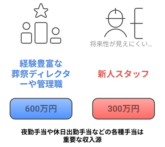 特に地方の中小葬儀社では、280万円台の低い年収に留まるケースも珍しくありません。