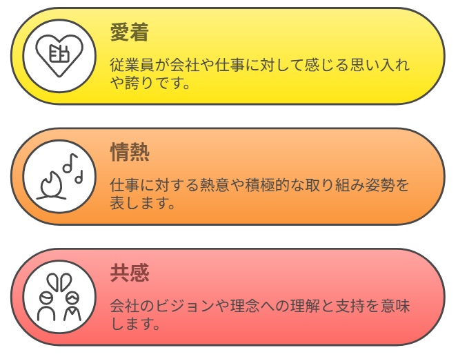 「愛着」は、従業員が会社や仕事に対して感じる思い入れや誇りです。