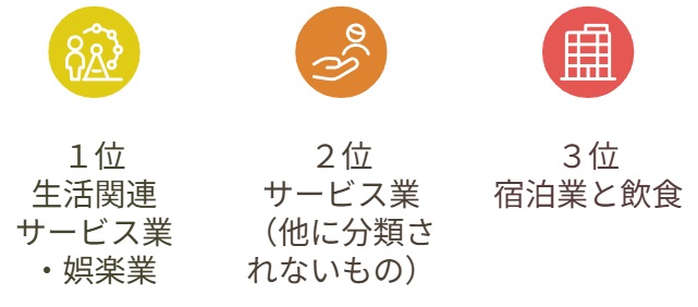 特に注目すべきは、1位「生活関連サービス業・娯楽業」20.8%、2位「 サービス業(他に分類されないもの)」19.3%、3位「宿泊業・飲食サービス業」18.2%と続いている点です。