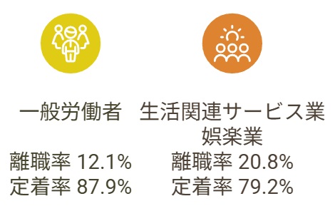 一般労働者の定着率87.9%、離職率12.1%という全業種平均と比較すると、生活関連サービス業、娯楽業の一般労働者の定着率は79.2%と8.7ポイント低くなっており、人材の定着が難しい業界であることがわかります。