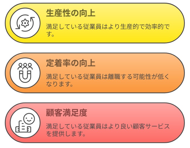 ES(従業員満足度)の向上により得られる主なメリットは以下の3つです。